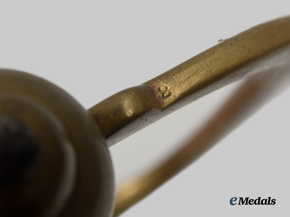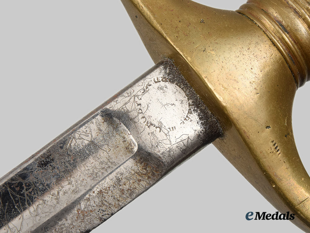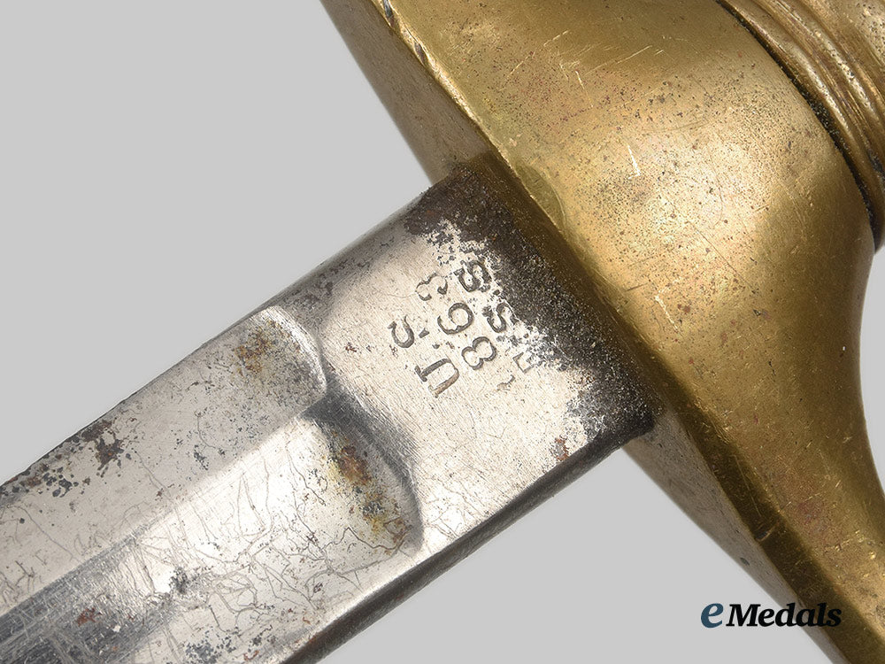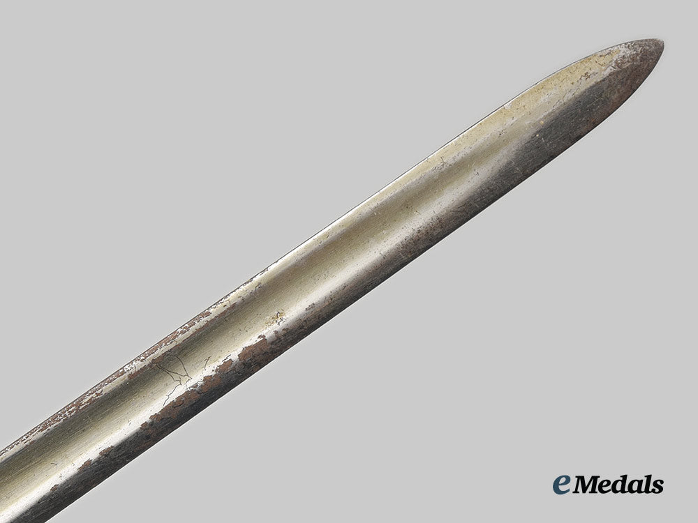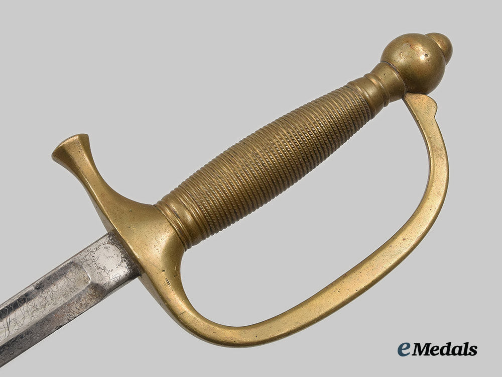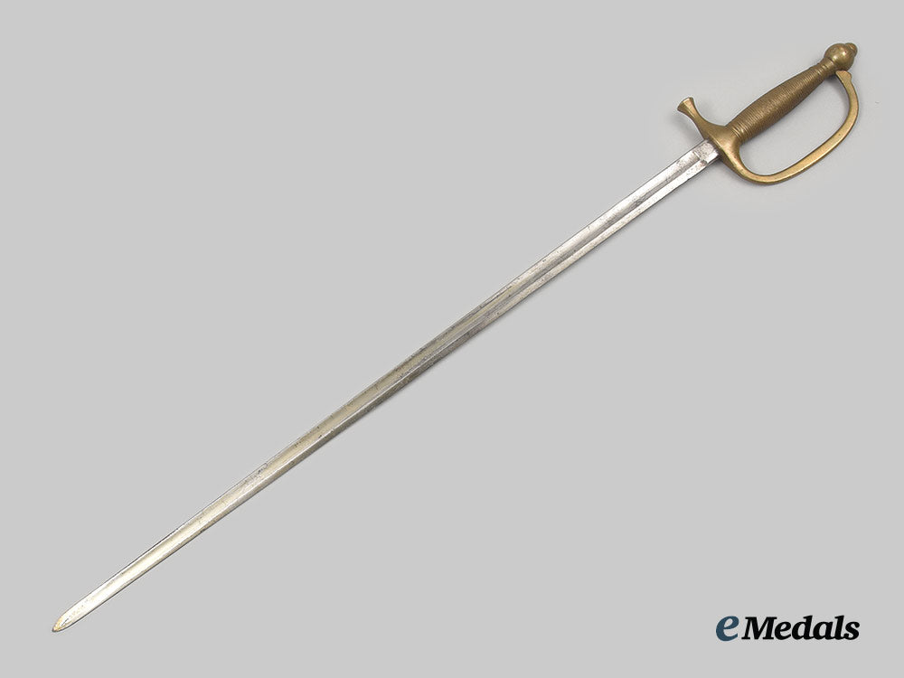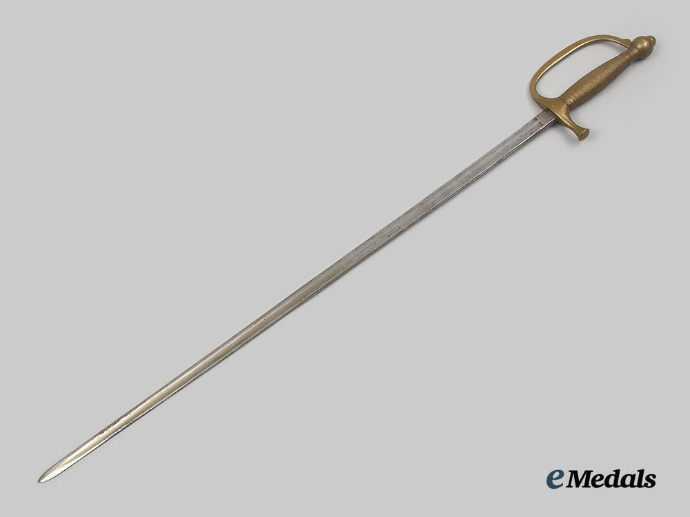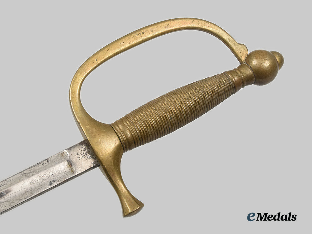 This sword features a 713 mm long steel blade, magnetic, with a semi-sharp edge and a very sharp tip, along with a wide spine, the fuller running almost the full length of the blade. It is marked "U.S. 1863 F.S.S." (F.S.S. = Frederick S. Strong, Government Armory Inspector 1862-1863) on the obverse ricasso, the reverse ricasso maker marked in a circle "C. ROBY. / W. CHELMSFORD MS" (Christopher Roby; "MS" for Massachusetts, not "MA" as used today). The hilt is in brass, the crossguard with a wide quillon with a domed end, the guard stamped "F.S.S." (Frederick S. Strong) at the centrepoint on the obverse and matching the mark used on the obverse ricasso on the blade, the grip giving the appearance of wire wrap but is integral with the handle, the pommel formed by a large ball and finished with a button end, the sword measuring 875 mm in length and is without its scabbard. It exhibits spotting and multiple contact marks on the blade, with discoloration and contact marks overall present on the hilt. Fine.