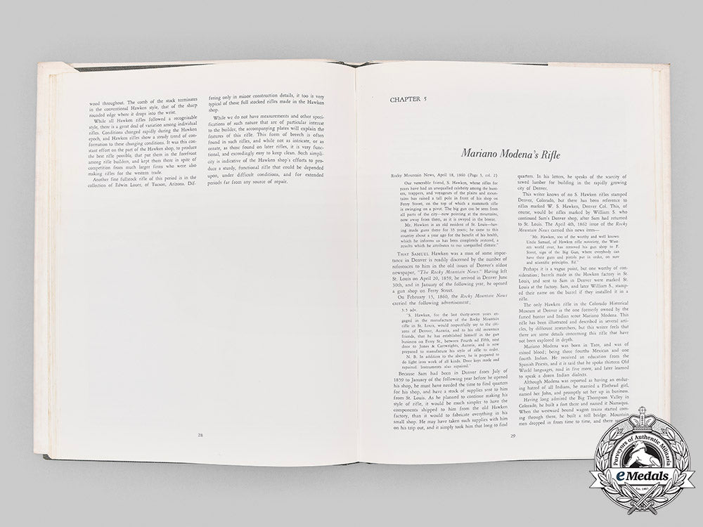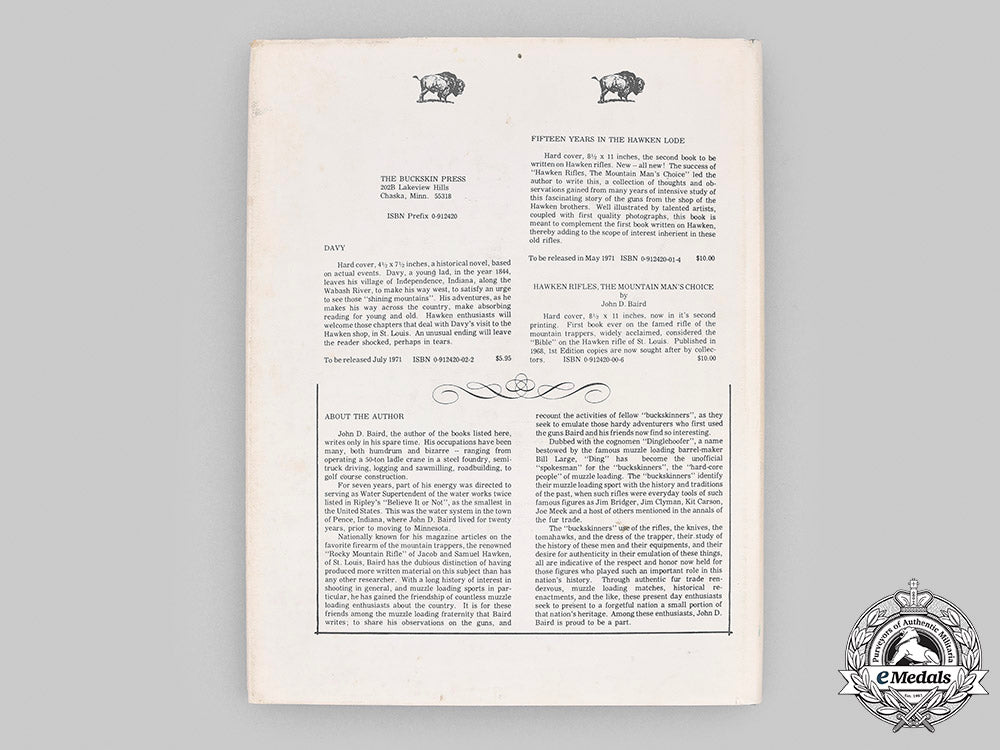 Hardcover, dark brown cloth cover, with dust jacket, entitled "Hawken Rifles - The Mountain Man's Choice" by John D. Baird, copyrighted by the author in 1968, second printing in 1971, published by The Buckskin Press of Chaska, Minnesota, ISBN 0-912420-00-6. The book begins with a Table of Contents, followed by an Overleaf, an Introduction, a Preface, and a Chronological Record of Events Connected with Hawken Shop. It contains fifteen chapters: 1 - The Hawken Customer; 2 - Jacob and Samuel Hawken, St. Louis; 3 - Early Hawken Rifles; 4 - Full Stock Hawken Rifles; 5 - Mariano Modena Rifle; 6 - Engraved Hawken Rifles; 7 - Hoffman and Campbell, A Hawken Subsidiary; 8 - Hawken Rifles for the Mountain Man; 9 - The Slant Breech Hawken; 10 - Firearms Other Than "Mountain Rifles"; 11 - Spencer Hawken Conversions; 12 - J.P. Gemmer, Successor to the Hawkens; 13 - Identifying and Dating Hawken Rifles; 14 - Modern Hawken Replicas; 15 - Miscellany. It encompasses 136 black and white plates placed throughout the book, illustrating photographs of the various rifles and their users, plus line drawings of an assortment of rifle parts, complemented by descriptive text. It concludes with a two page Index. The book contains 116 pages, printed in black ink, on a white paper stock, measuring 220 mm (w) x 285 mm (h) x 15 mm (d). It exhibits foxing along the top and sides of the pages, in addition to extensive tape repair on page 95-96 and soiling on the dust jacket. Fine.