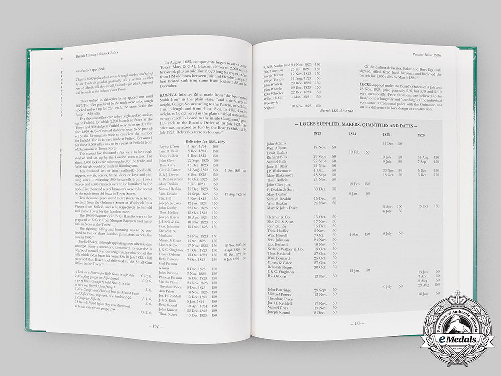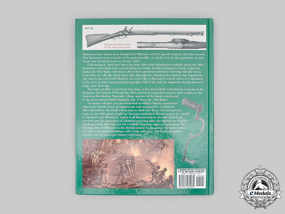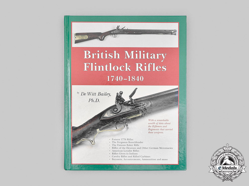 Hardcover, gloss-finished front and back covers with color photographs, entitled "British Military Flintlock Rifles 1740-1840", First Edition, by De Witt Bailey, Ph.D., Andrew Mowbray Publishers of Lincoln, Rhode Island, printed in the United States of America in 2002, Library of Congress Control Number 2002108590, ISBN 1-931464-03-0. A brief synopsis of the book's contents appears on the back cover: "Historians have always been intrigued by Riflemen and the special weapons that they carried. This fascination even extends to the general public, as can be seen by the popularity of such books and television shows as "Sharpe's Rifles". Unfortunately, until now there has been little solid information available about the rifles themselves and which units carried them into battle. In this exciting new book, respected author De Witt Bailey will answer all of these questions and more! Starting with the Seven Years War, he tells the whole story right through the American Revolution, the Napoleonic Age and to the end of the flintlock era. Each rifle is illustrated (exactly where it is discussed in the text) in truly exceptional photographs, 320 in all, with the important details shown in large, clear close-ups. The types of rifles covered are too many to list, but include such famous weapons as the Ferguson, the Pattern 1776 and the rifles used by German mercenaries and royalists in the American Revolution. Naturally, a large portion of the book is dedicated to the most famous British flintlock rifle of them all - the Baker. No matter whether you are interested in military history, marksmanship in the British Army, accoutrements and ammunition, or flintlock rifles themselves, this book will be sure to thrill you. Even such unexpected topics as the rifles given as gifts to American Indians in British service are carefully explained and illustrated. And it is all documented by decades of archival research and the inspection of countless surviving rifles throughout the English-speaking world. Whether you are a military historian eager to learn about the exciting story of Riflemen in the British service, or an antique firearms enthusiast who needs help identifying a rifle in his collection, this book will quickly become one of your most trusted references." The book begins with a Table of Contents and an Introduction. It is divided into seventeen chapters: 1 - The Beginnings: 1740-1772; 2- The American War, First Phase; 3- The Ferguson Rifle from Manufacture to the Battle of Monmouth Court House; 4- German Riflemen and their Rifles in the American War; 5 - Loyalist Riflemen 1775-1783; 6 - Indian Rifles in British Service to 1783; 7 - Rifle Development in the Interwar Years, 1783-1793; 8 - The British Rifle and Rifle-armed Units during the French Revolutionary Wars, 1793-1802; 9 - The Baker Infantry Rifle, 1800-1814; 10 - Cavalry Rifles, 1790s-1828; 11 - Postwar Baker Rifles; 12 - Baker Rifle Bayonets, 1800-1838; 13 - Accoutrements and Ammunition for the Baker Rifle; 14 - Rifle Corps in the British Army, 1798-1841; 15 - British Army Rifle Marksmanship with the Flintlock Rifle; 16 - Rifles for Indians in British Service, 1783-1840; 17 - A Miscellany of Unexplained British Military Rifles. It concludes with an Appendices, Endnotes Listed by Chapter, a Bibliography of Printed Works and an Index. The book contains 264 pages, printed in black ink, on a satin-finished white paper stock, measuring 220 mm (w) x 285 mm (h) x 20 mm (d). Near extremely fine.