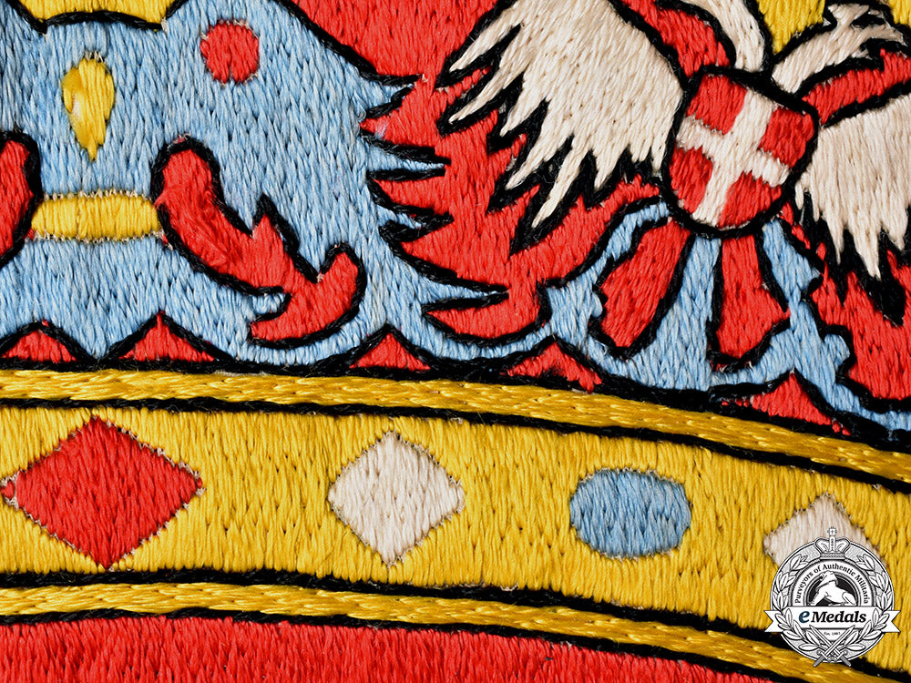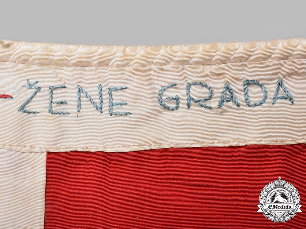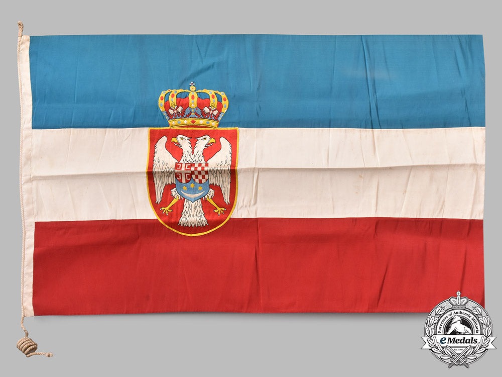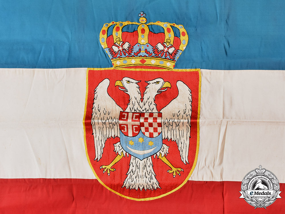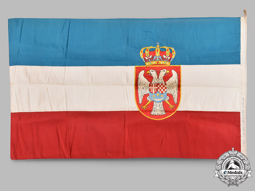(Ratna zastava podmornice „Nebojša“); A high quality rayon flag, with blue, white and red sections sewn together, in the center (on both sides) extremely well executed Royal Yugoslav Coat of Arms, hand embroidered in various colors in rayon threads; the front end section complete with a rope, and additionally hand embroidered dedication in blue threads "Nebojši žene grada Šibenika - 1928"; flag measures approximately 150cm x 85cm, in extremely fine condition, and with a dedication, one-of-a-kind. Only few such flags are known to exists, and are in the museums.