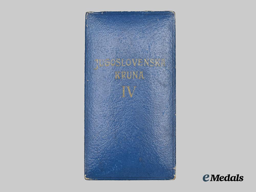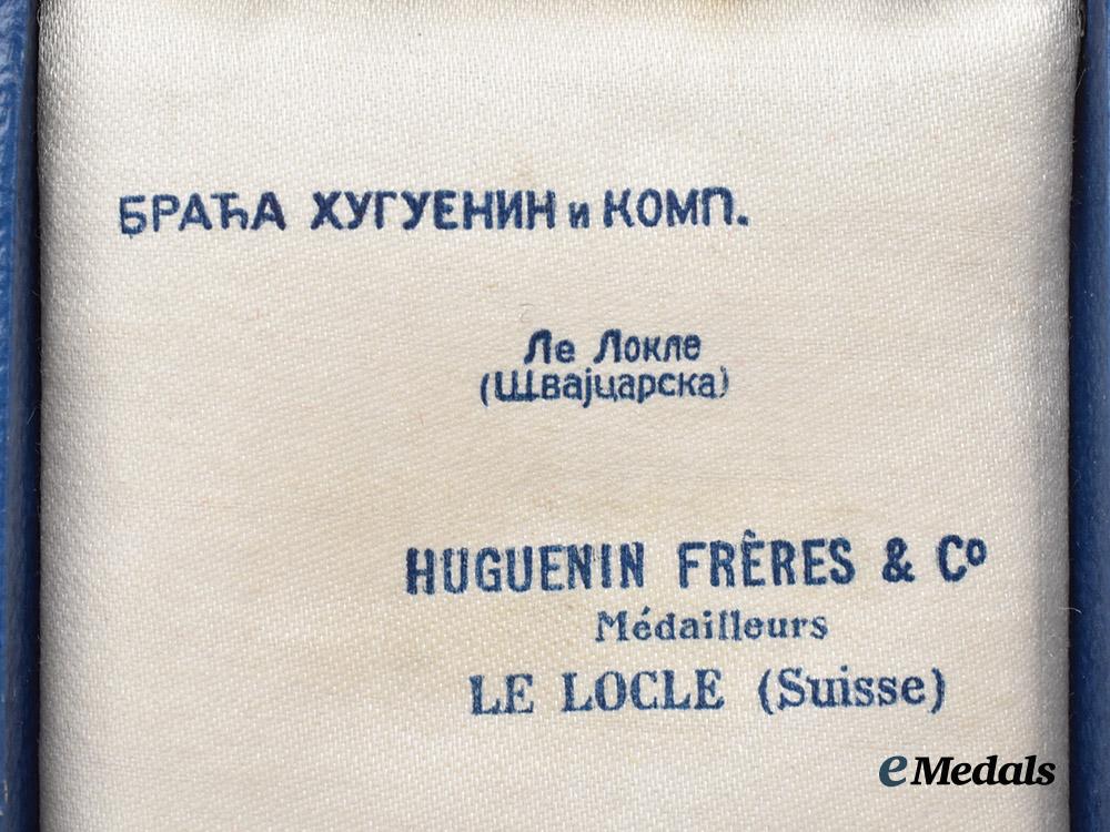 Accompanied by its case of issue, a dark blue leatherette exterior, inscribed "JUGOSLOVENSKA KRUNA IV" on the lid, maker marked "HUGUENIN FRERES & Co. LE LOCALE Medailleurs (Suisse)" on the inside lid, recessed black velvet medal bed, measures 70mm (w) x 128mm (l) x 23mm (d), wear to exterior and loss of silk across interior hinge, clasp functional, in very fine condition.
