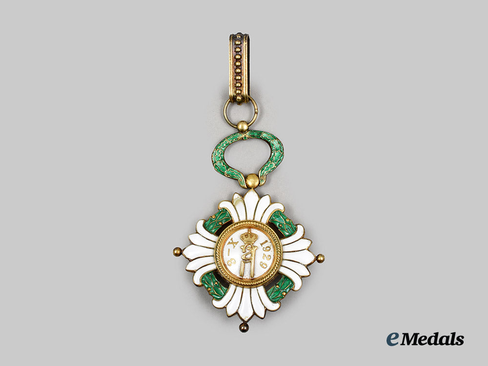 (Orden Jugoslavenske Krune). Instituted in 1930. (Type II with laurel wreath suspension). Constructed of silver gilt with red, white, and green enamels, on a green enameled laurel wreath with a pierced ball and swivel loop and broad ring for suspension from its shortened period original ribbon, consisting of a white enameld multi-ray cross with a green enameled laurel wreath in the quadrants between the arms of the cross, the obverse featuring a central white enameled medallion bearing the Yugoslav royal crown with beautifully executed enamels within a coin-edge rim, the reverse with a similar central medallion bearing the crowned royal cipher marked “1929” in gilt lettering, unmarked, measuring 54.4 mm (w) x 76.4 mm (l) including its wreath suspension, in near extremely fine condition.
