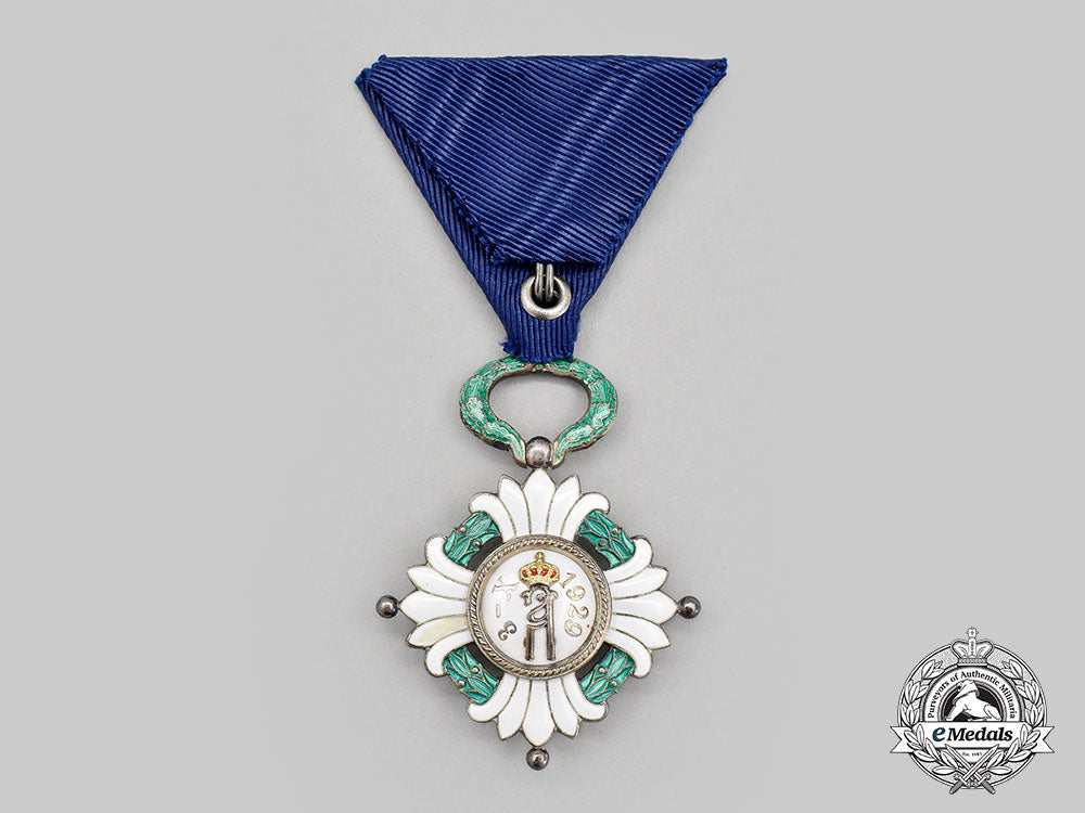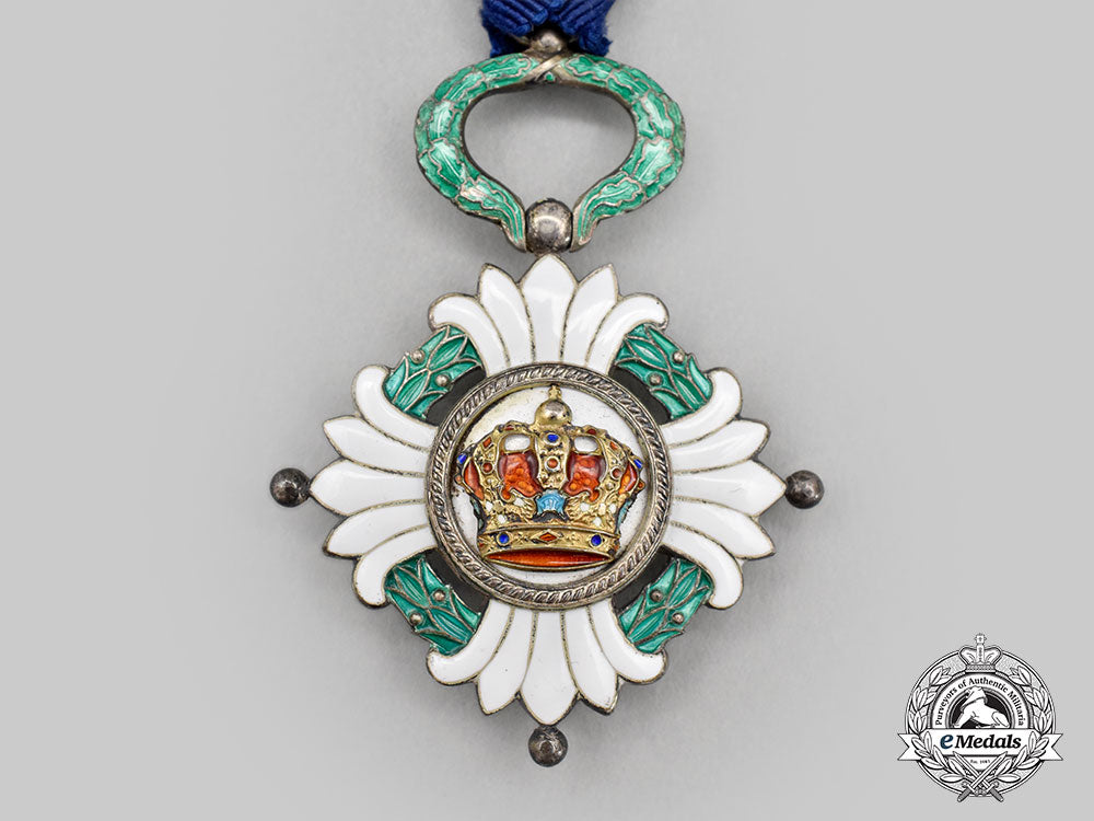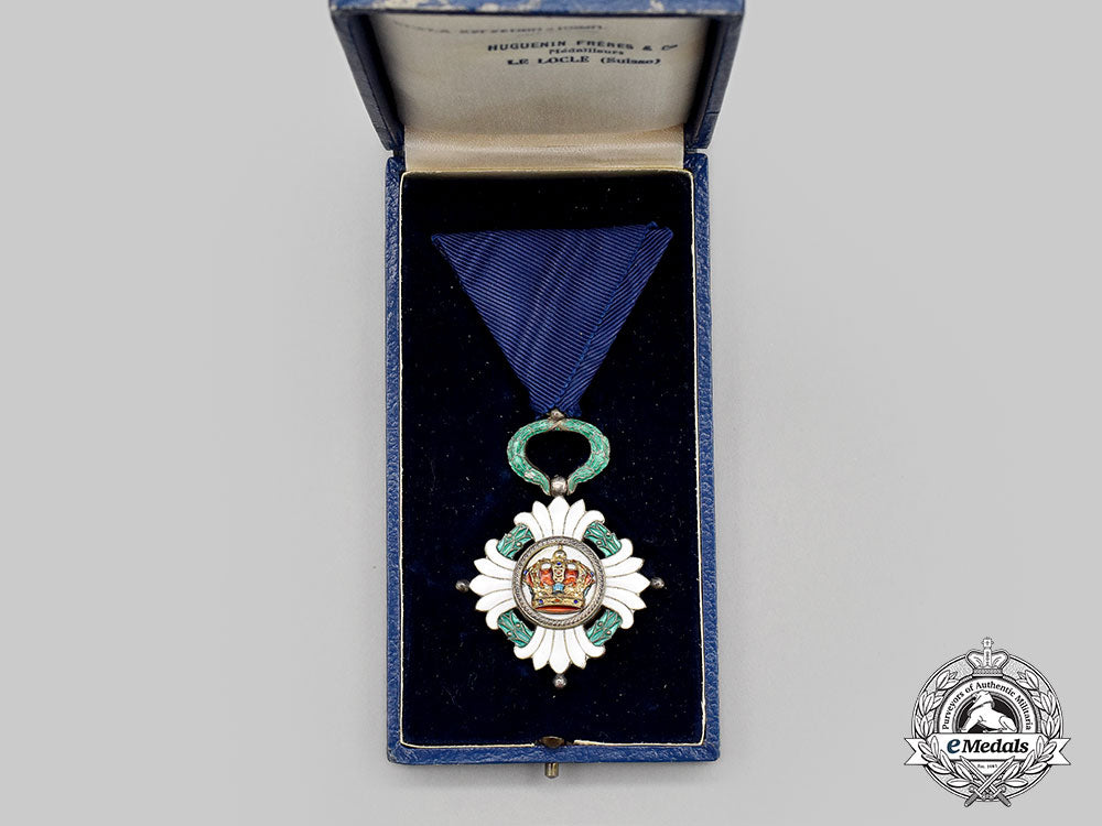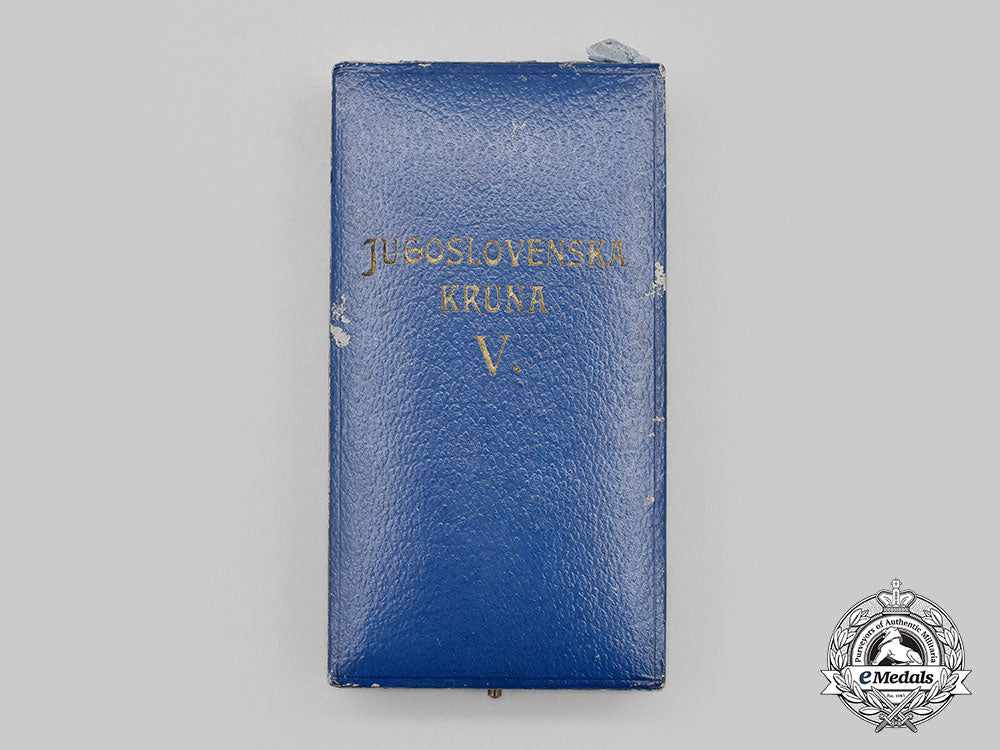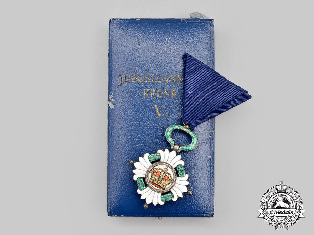 (Orden Jugoslavenske krune). Instituted in 1930; Discontinued in 1945. Multi-piece construction, in silver gilt with red, white, green, light blue and dark blue enamels, unmarked, measuring 42.8 mm (w) x 58 mm (h) inclusive of its wreath and laterally-pierced ball suspension, repair evident in the white enamels on a single ray at 3 o'clock on the reverse, otherwise, the enamels are intact, original triangular ribbon with hook and eye, near extremely fine. In its hardshelled case of issue, the lid marked in gold-coloured ink "JUGOSLOVENSKA KRUNA V." (Yugoslav Crown V Class), inside lid in white cloth, padded and maker marked "HUGUENIN FRERES & Co Médailleurs LE LOCLE (Suisse)" in French and Serbian, base with a recessed medal bed in navy blue felt, measuring 67.7 mm (w) x 126.5 mm (h) x 23.5 mm (d), case near very fine.