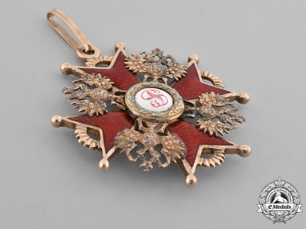 Орден Святого Станислава. Instituted in 1765. In Gold with red enamels, handpainted "S" on both centrepieces, weighing 17.1 grams, marked "56" beside the St. Petersburg city mark on the reverse of the integral ring, partial mark of the Russian coat-of-arms on the arm at 12 o'clock and maker marked "AK" (Albert Keibel, St. Petersburg, 1899-1908) on the arm at 6 o'clock on the reverse, measuring 40.3 mm (w) x 43.8 mm (h) inclusive of its integral suspension, light contact, intact enamels, near extremely fine.